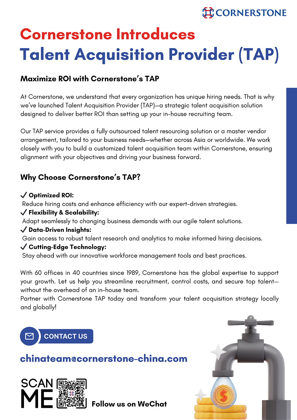 在 Cornerstone,我们深知每一家企业在人才招聘上的需求都不尽相同。正因如此,我们推出了 TAP(Talent Acquisition Provider)战略招聘服务——相比自建内部招聘团队,这是一项更具性价比的解决方案,助您实现更高的投资回报。